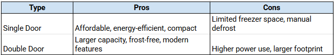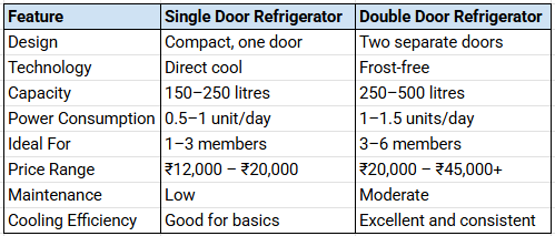 While single door models win on energy savings, the inverter technology in many double door refrigerators helps reduce long-term consumption, balancing the difference.